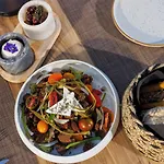 ארוחת הבוקר מוגשת כל בוקר במסעדה. האורחים יכולים לנסות ארוחות ים התיכוניות בבר גריל Rouga tou Mpaoula הממוקמת במרחק של 400 מטר.